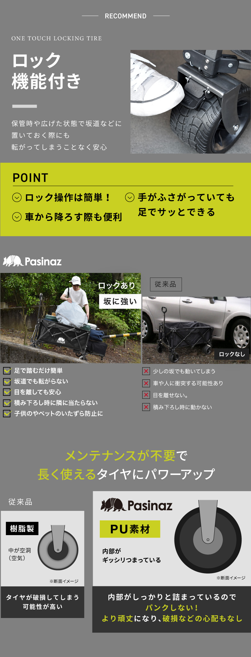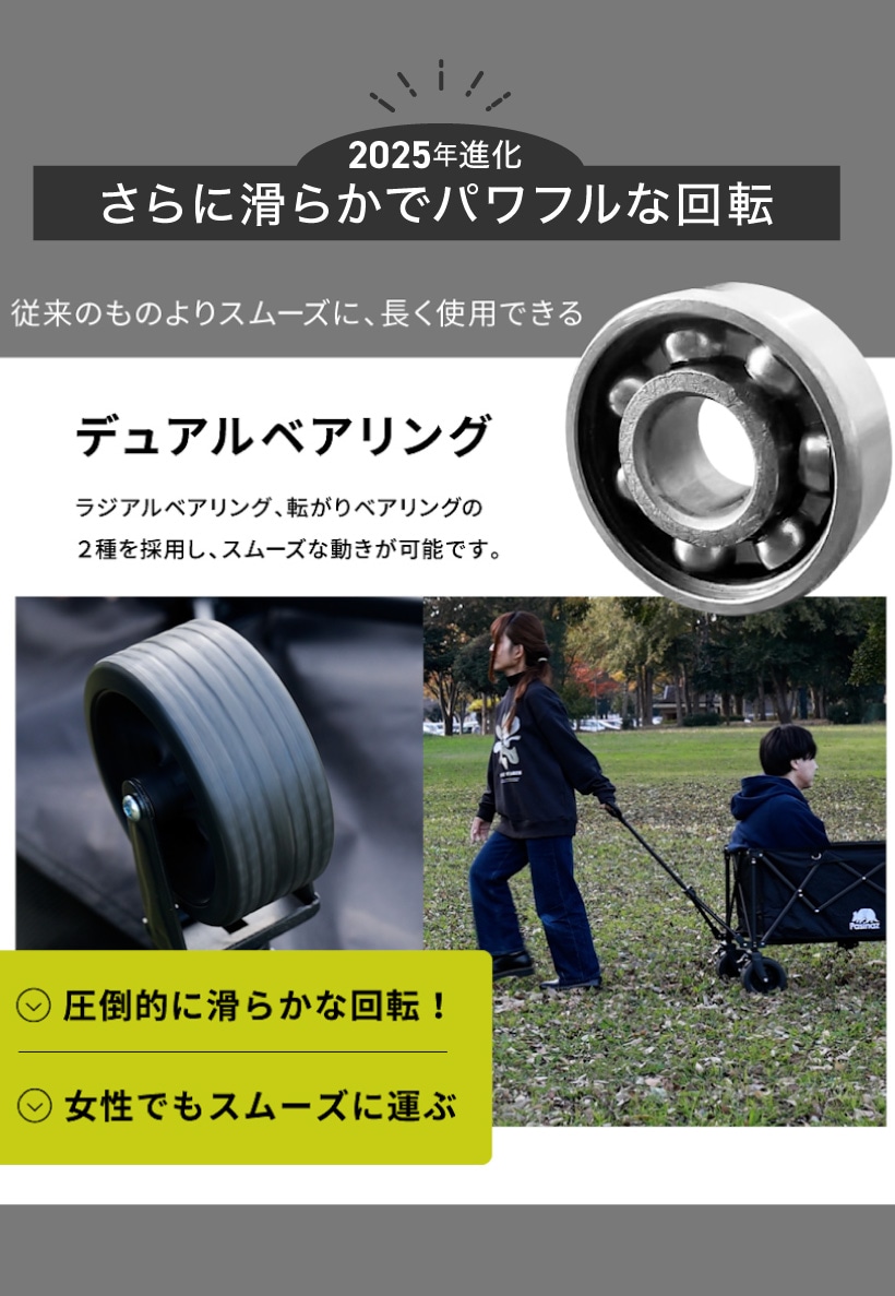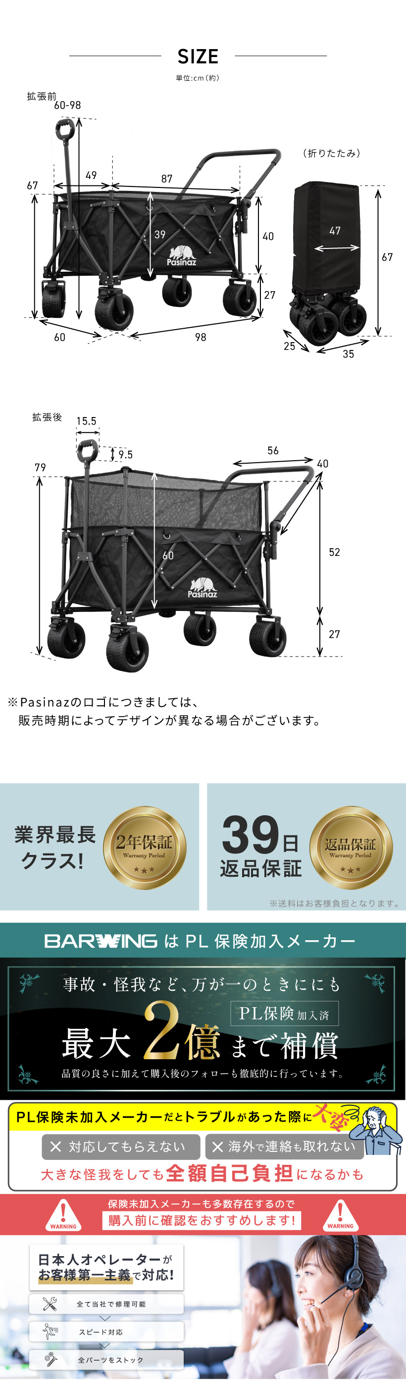 | 仕様 | ・片手用ハンドル、両手用ハンドル2way ・拡張式 ・10cmワイドタイヤ ・大容量258L |