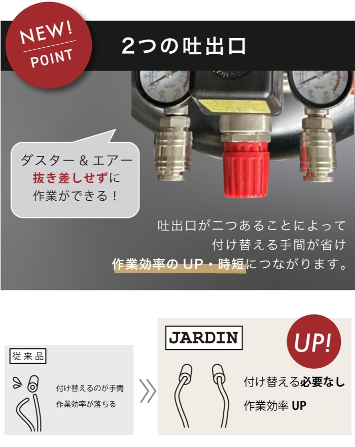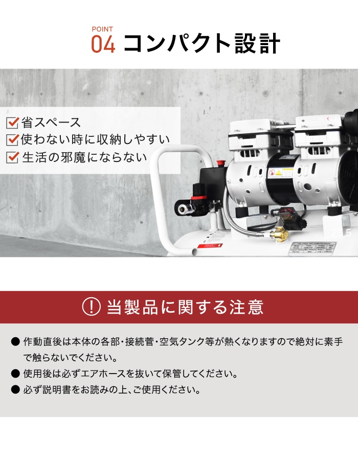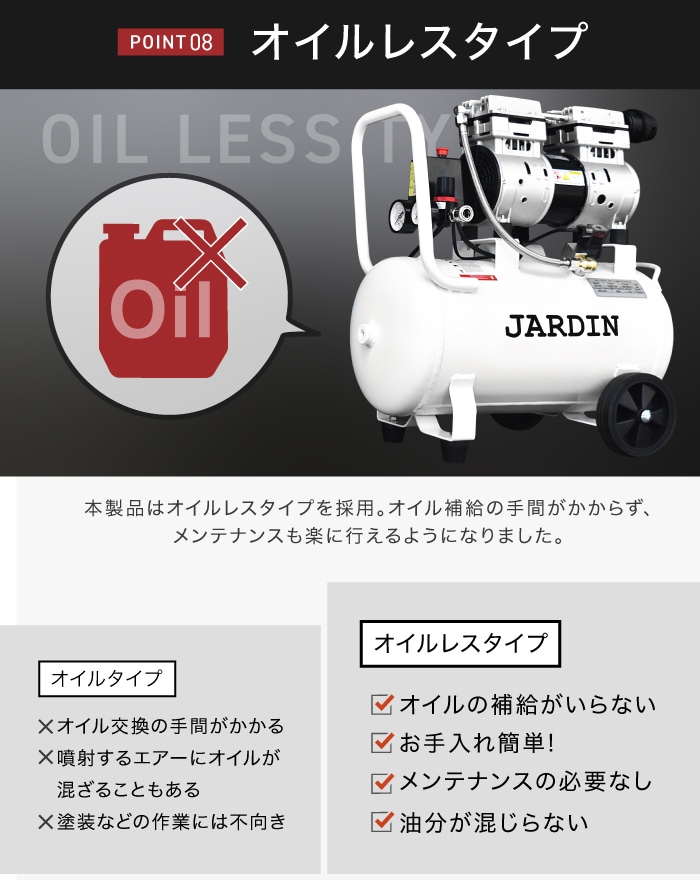 | 特徴 | ・静音性 ・圧力安定 ・大容量 ・圧力調整ノブ ・ワンタッチ接続 ・オイルレス ・コンセント式 ・ハンドル&タイヤ付き |