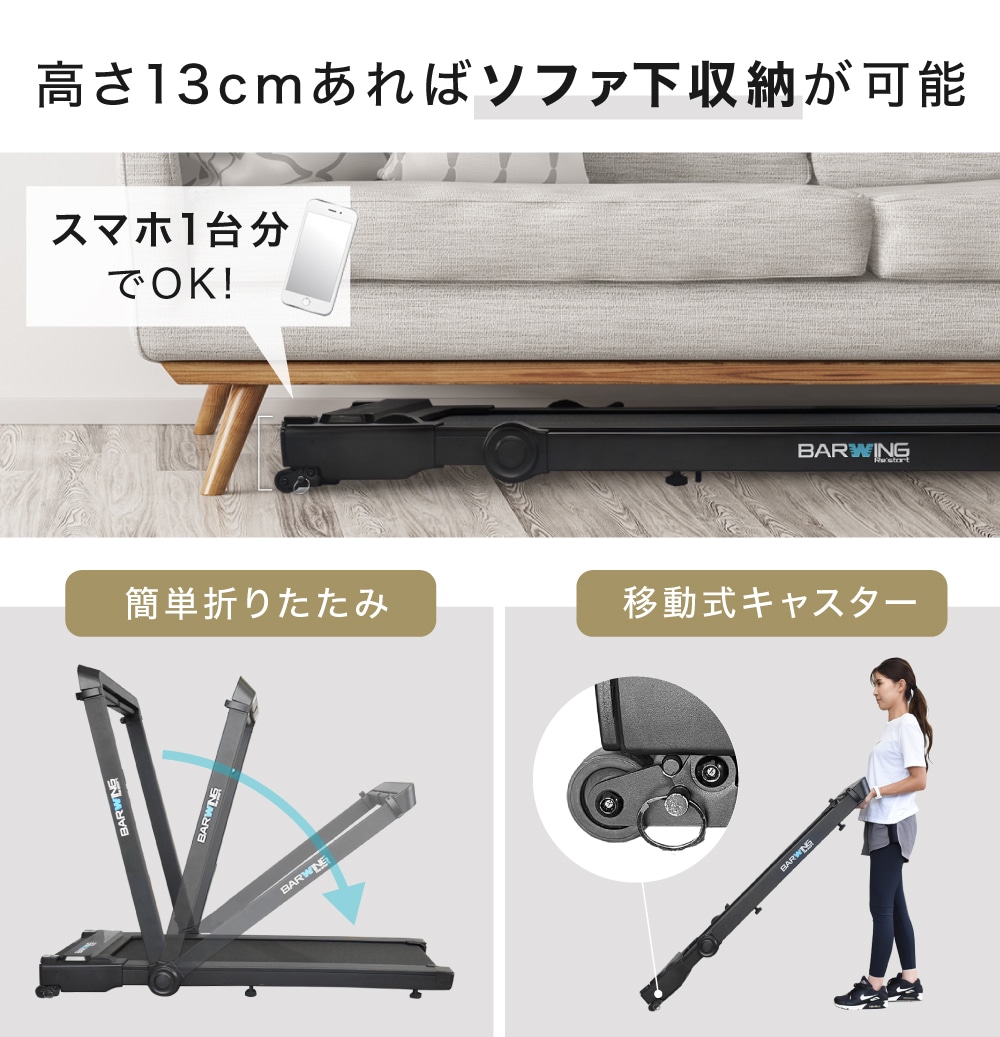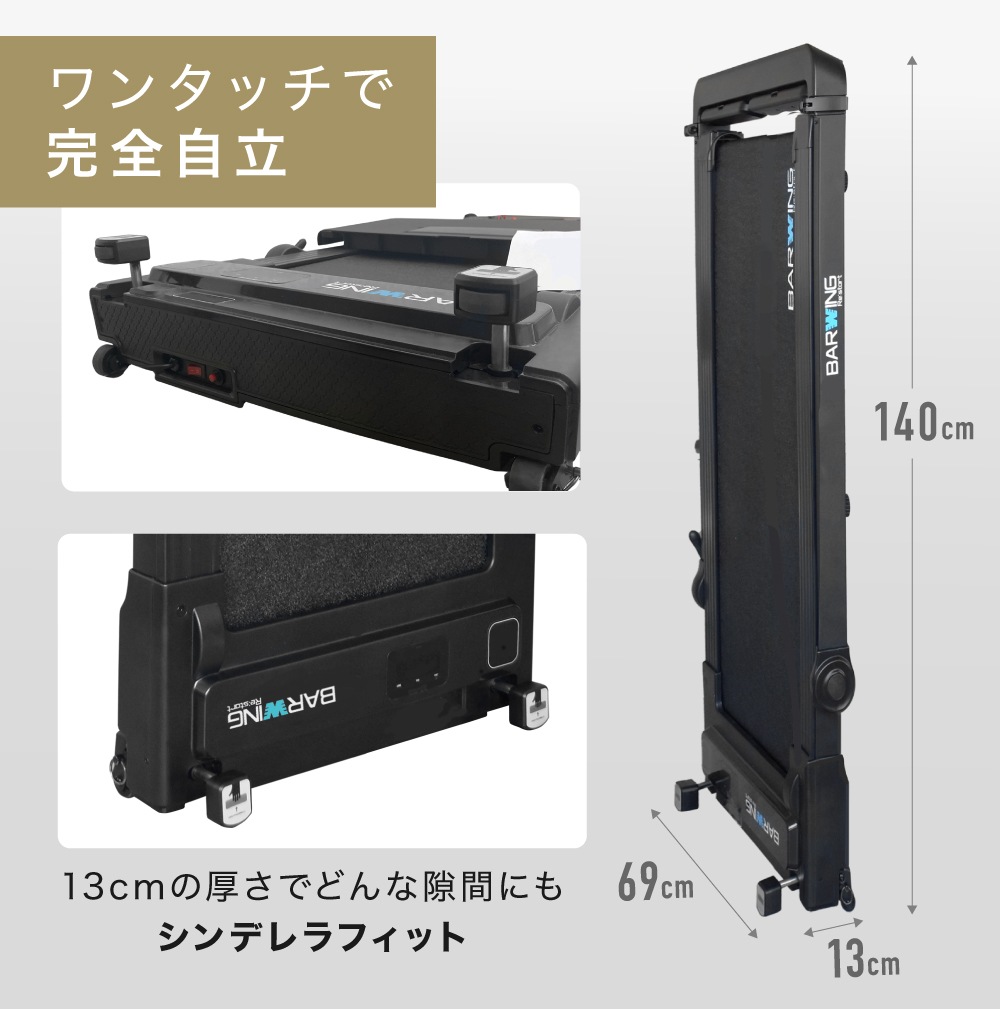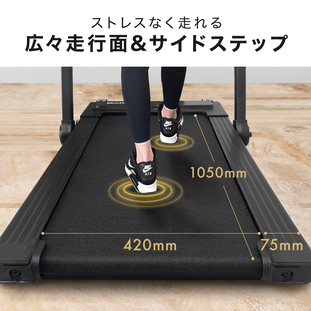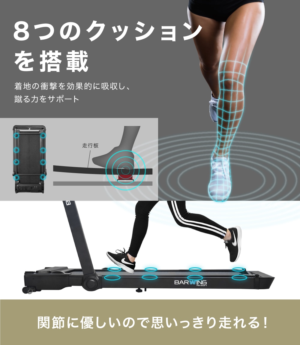 | 特徴 | ・8つの衝撃吸収クッション ・広々走行面 ・移動・収納ラクラク ・静音設計 ・タブレットホルダー付き ・慣性モーター |