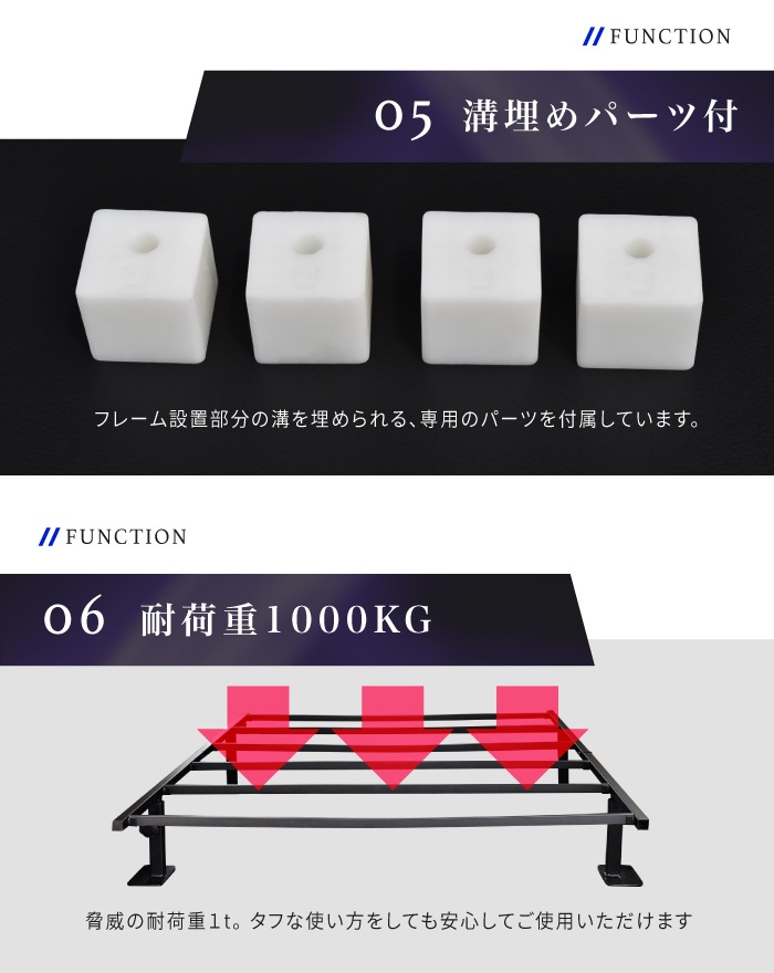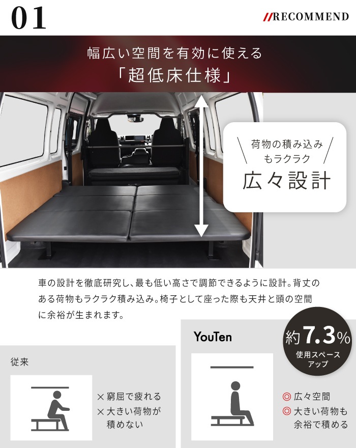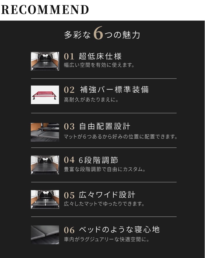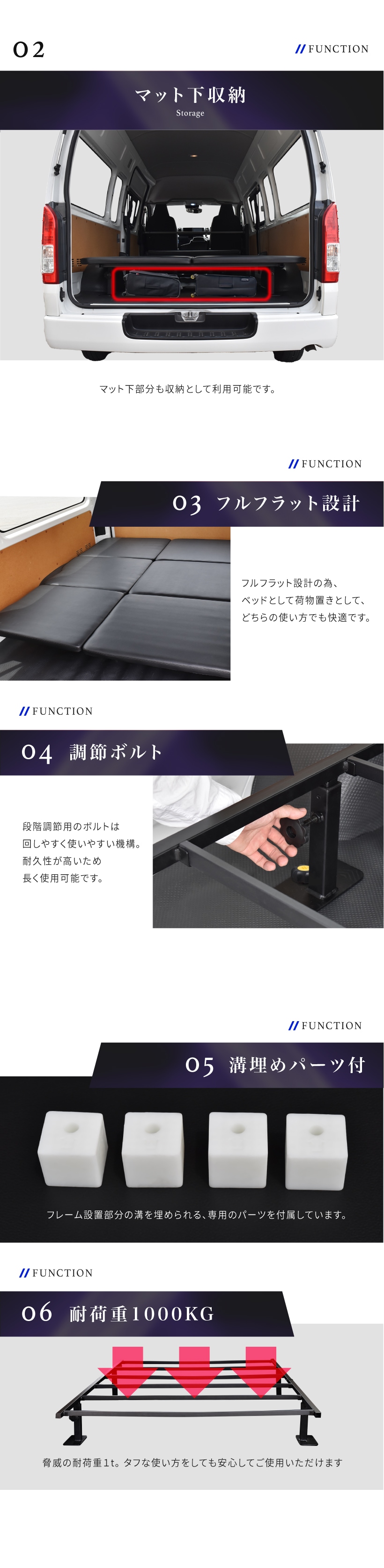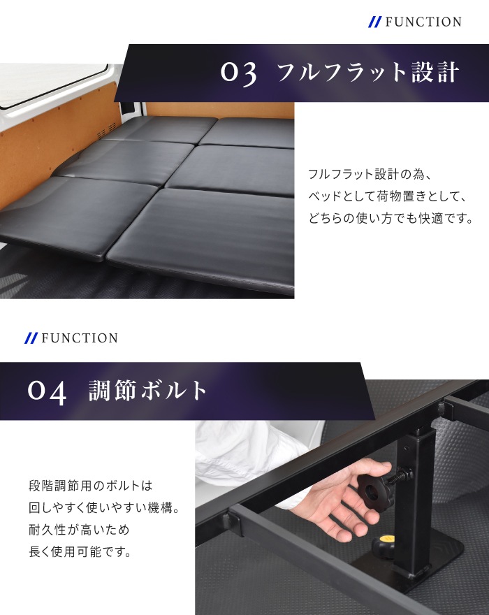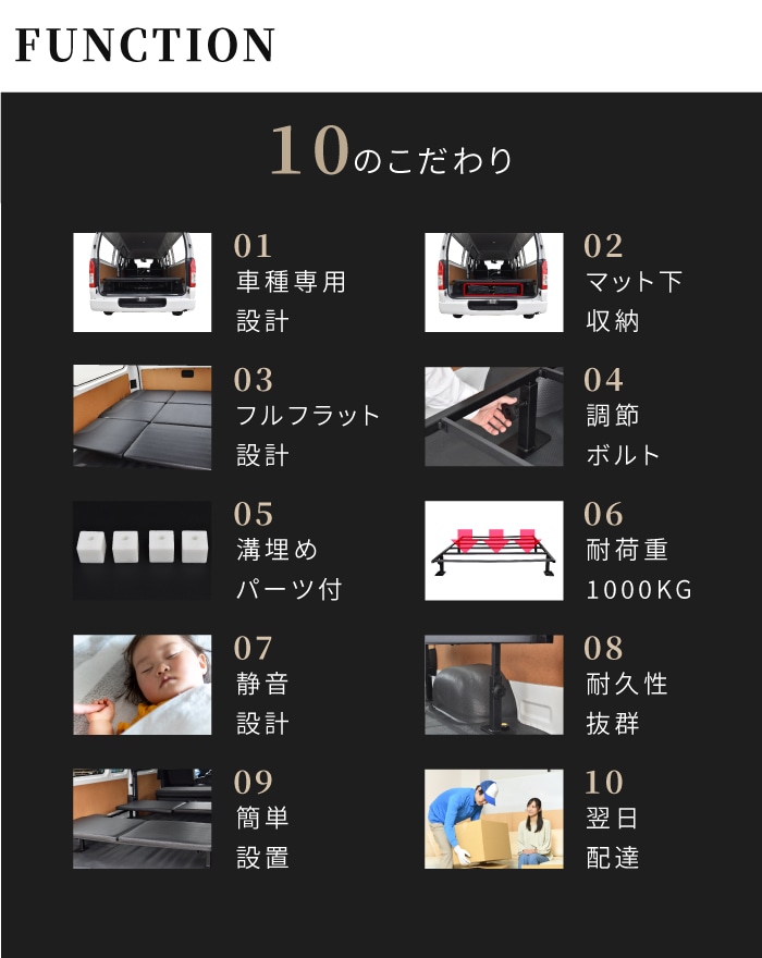 | 特徴 | ・車種専用設計 ・マット下収納 ・フルフラット設計 ・調節ボルト ・溝埋めパーツ付き ・耐荷重1000kg ・静音設計 ・耐久性抜群 ・簡単設置 ・翌日配達 |