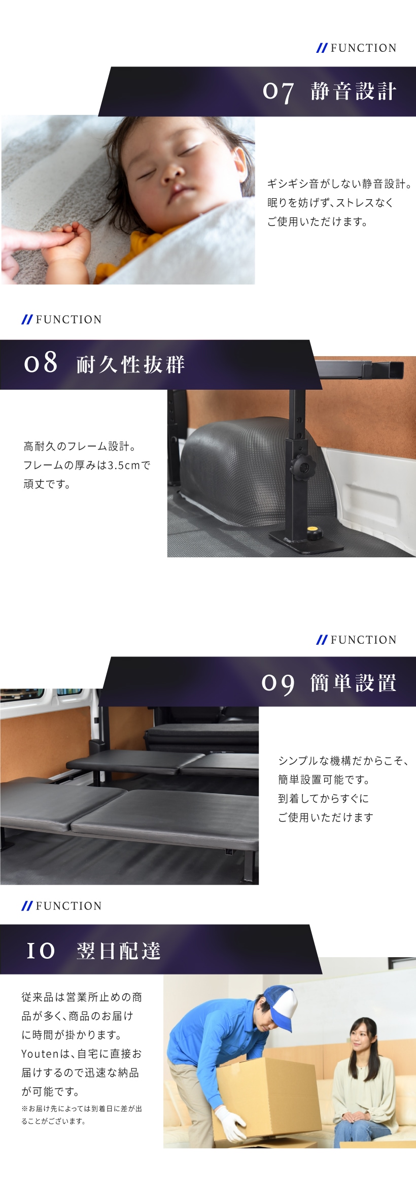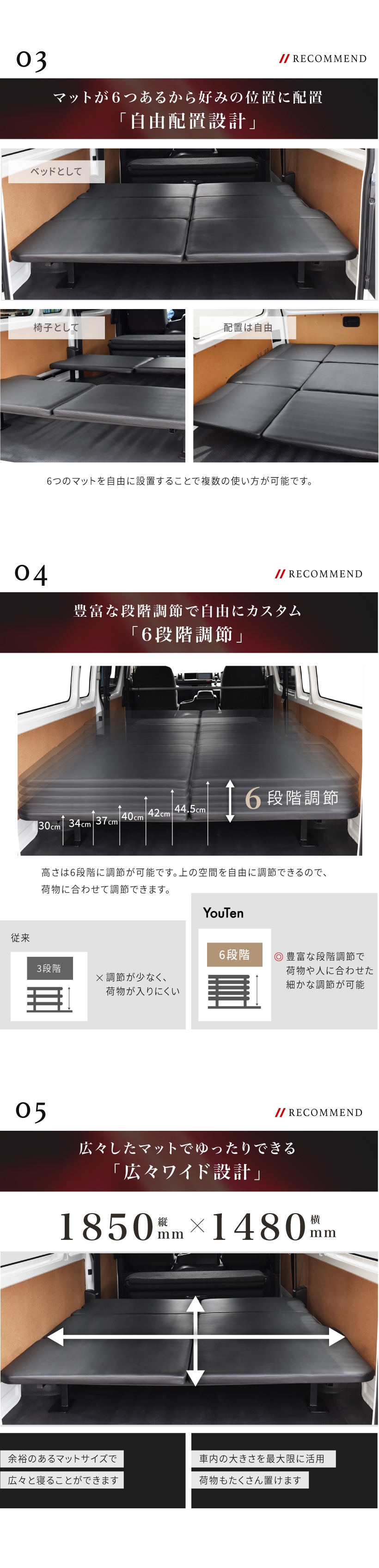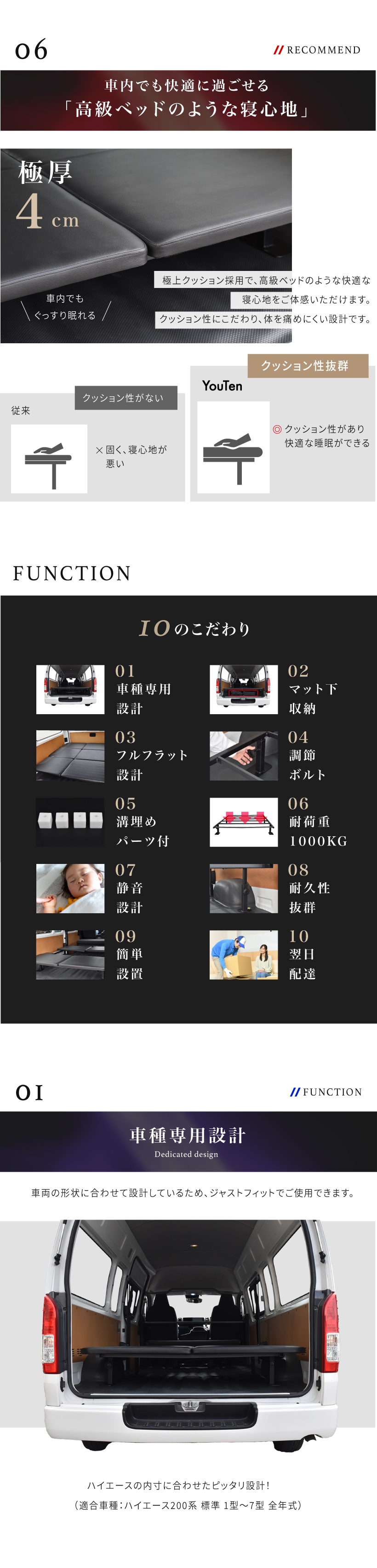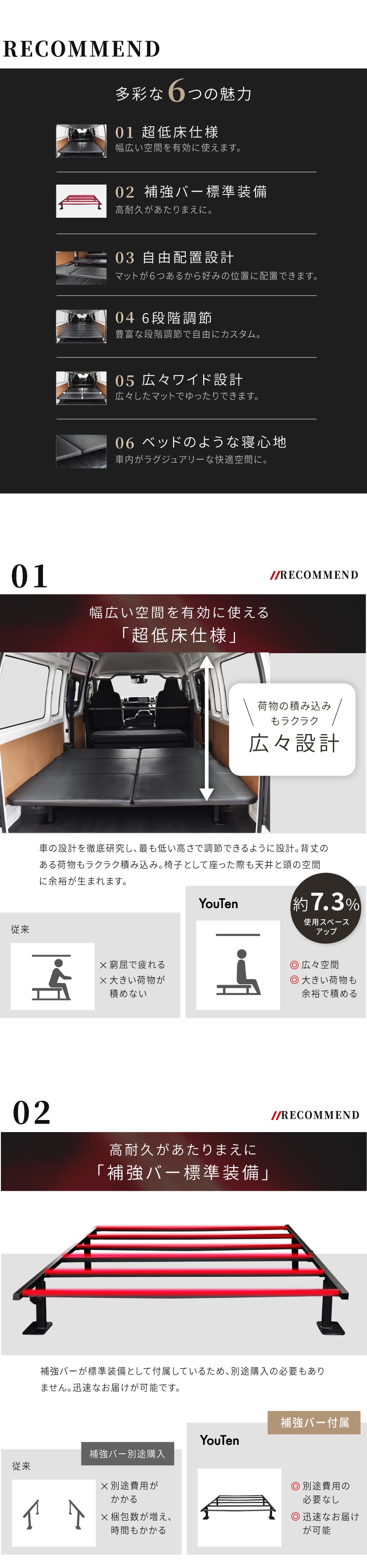 | 特徴 | ・車種専用設計 ・マット下収納 ・フルフラット設計 ・調節ボルト ・溝埋めパーツ付き ・耐荷重1000kg ・静音設計 ・耐久性抜群 ・簡単設置 ・翌日配達 |