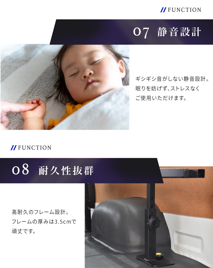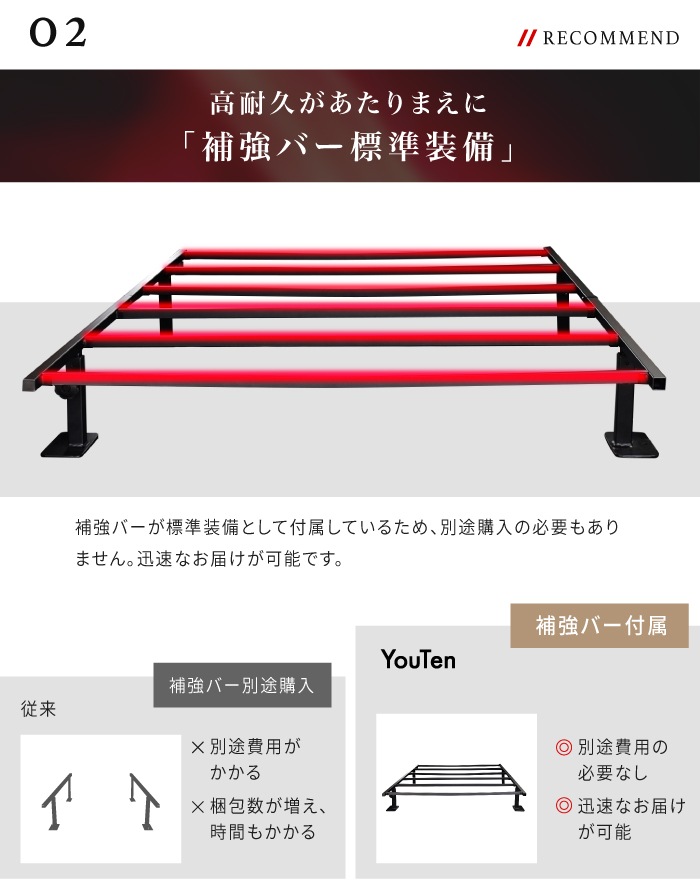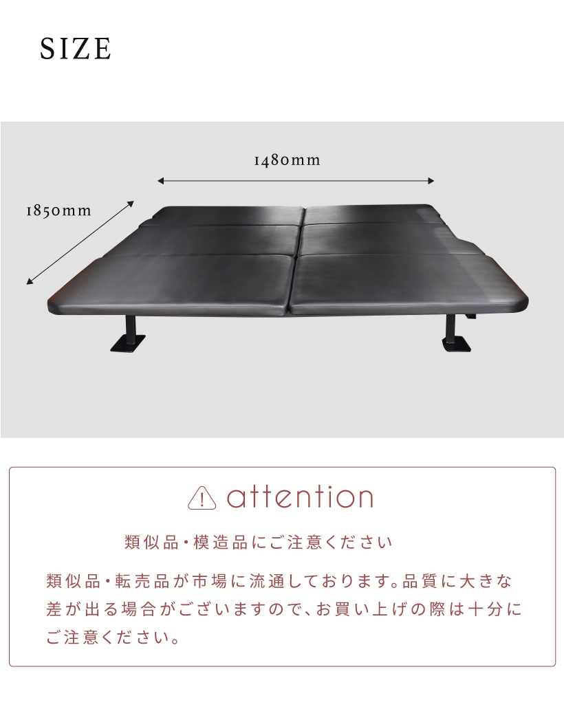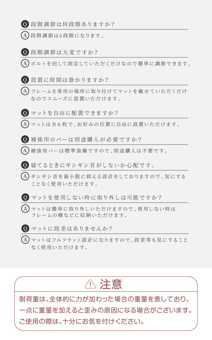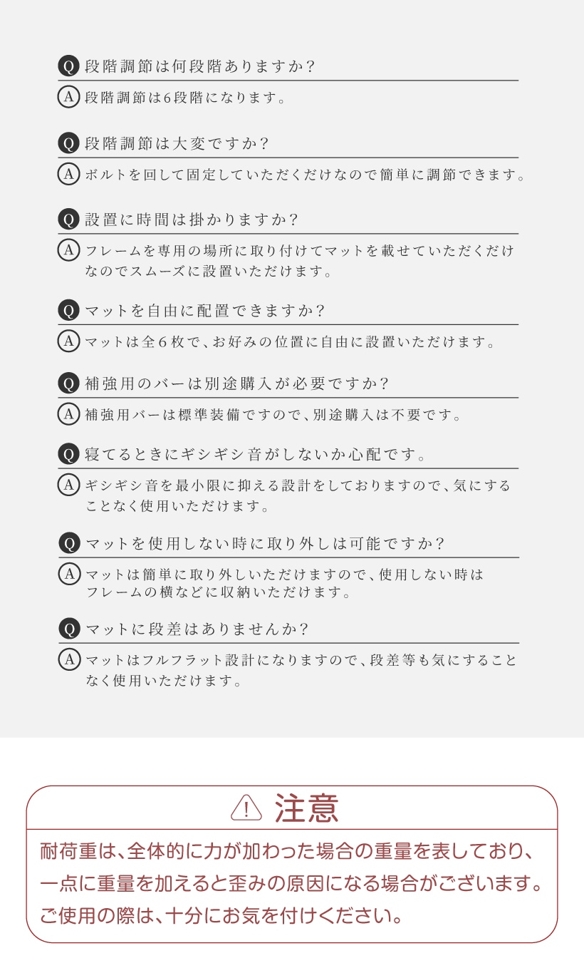 | 仕様 | ・超低床仕様 ・補強バー標準装備 ・自由配置設計 ・6段階調節 ・広々ワイド設計 ・ベッドのような寝心地 |