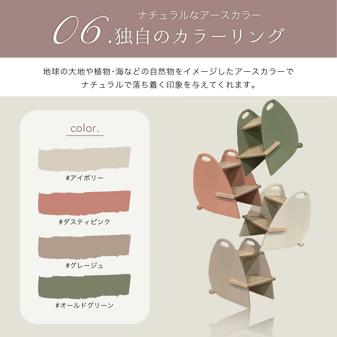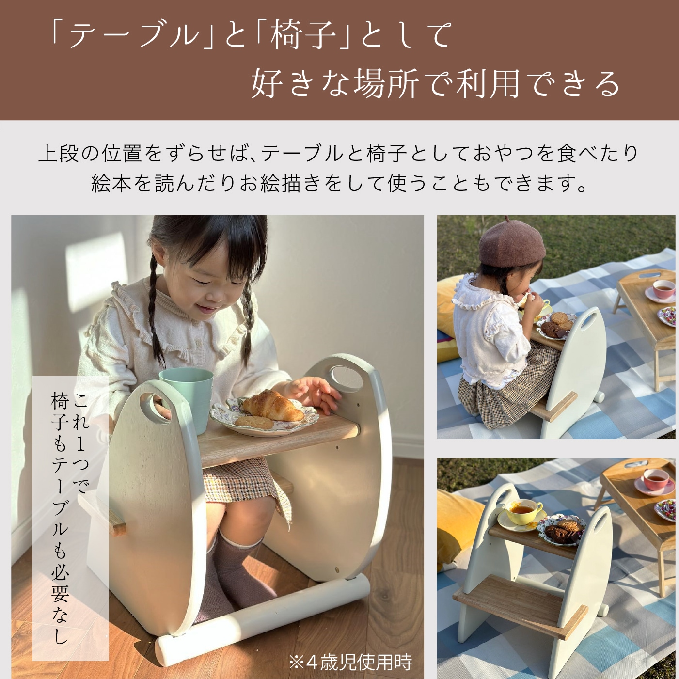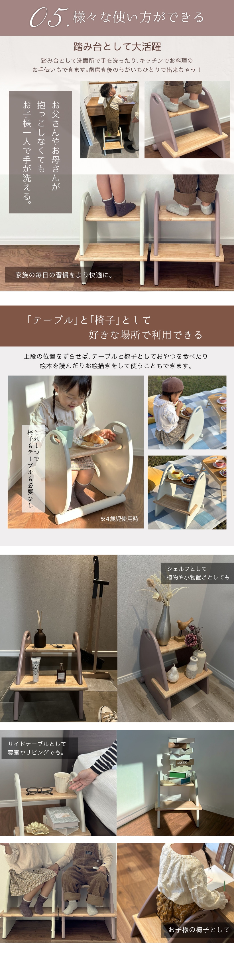 | 仕様 | ・高さ3段階調節 ・高さ40cm改良 ・家族で使える耐荷重80kg ・美しいフォルムと機能美 ・使い方無限大 (テーブルと椅子/踏み台/シェルフ/サイドテーブルなど) ・独自のカラーのくすみカラー |