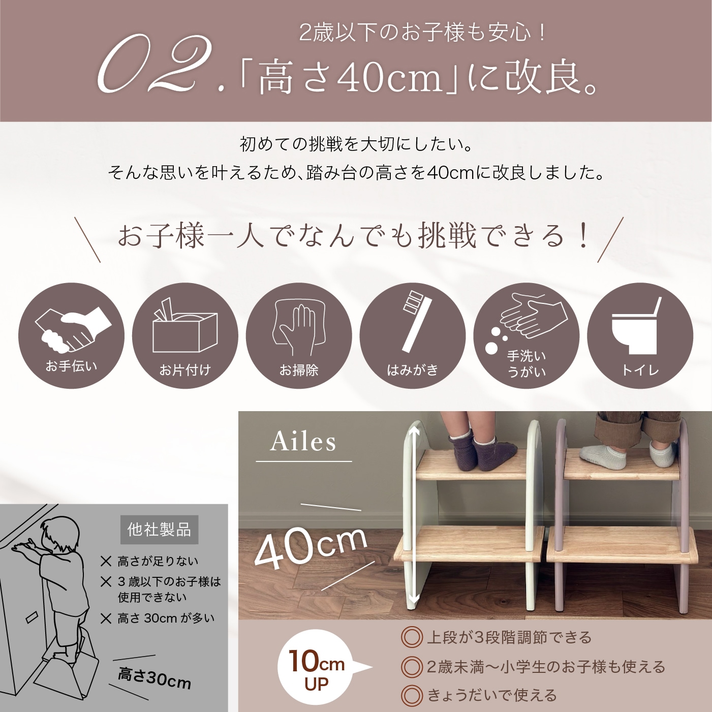 踏み台 子供用踏み台 木製踏み台 ステップ台 高さ調節3段階 高さ40cm キッズステップ おしゃれ 北欧 2段 1段 オーク材 スツール ステップ 子供 椅子 テーブル くすみカラー 木製 踏み台 子供 踏み台 キッズ踏み台 耐荷重80kg